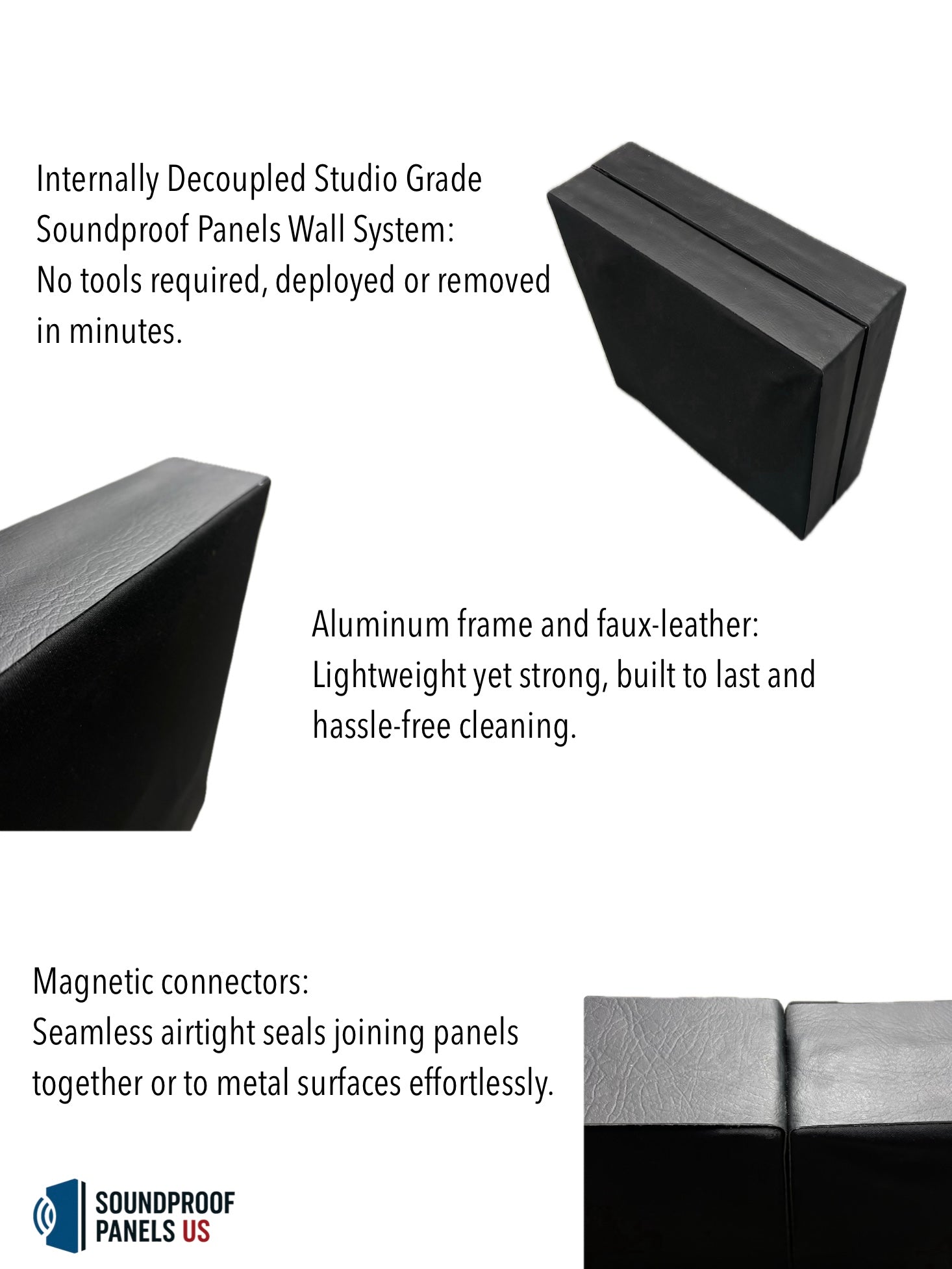Our removable soundproof wall has been engineered with internal decoupled layers that prevent sound transmission. Magnetic connectors provide an easy setup and airtight seals, creating an efficient way to block sound without modifying existing spaces.